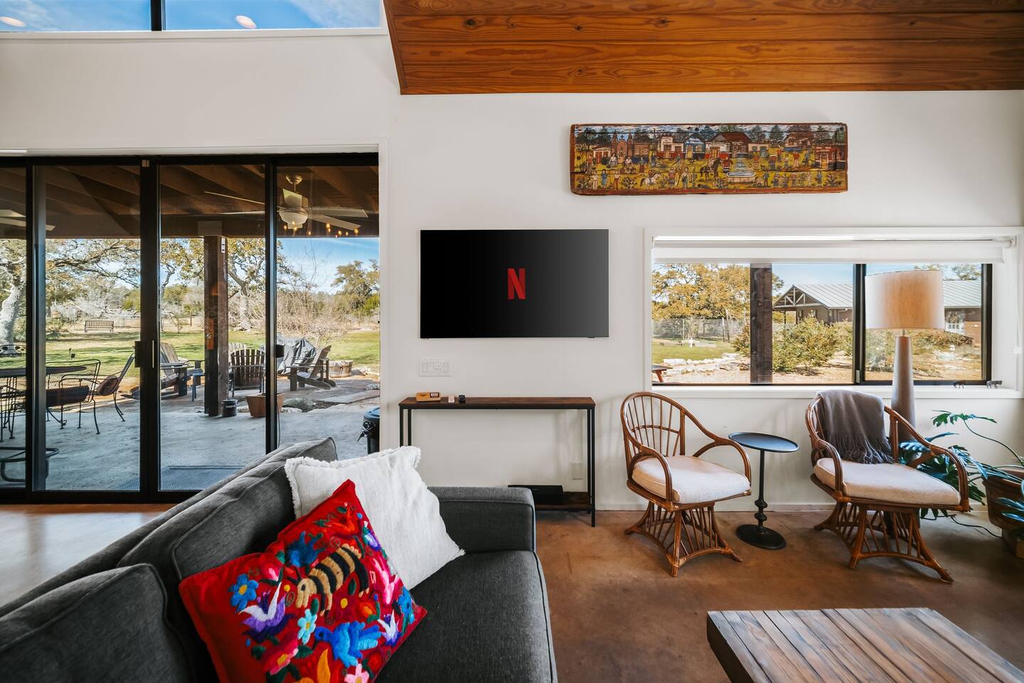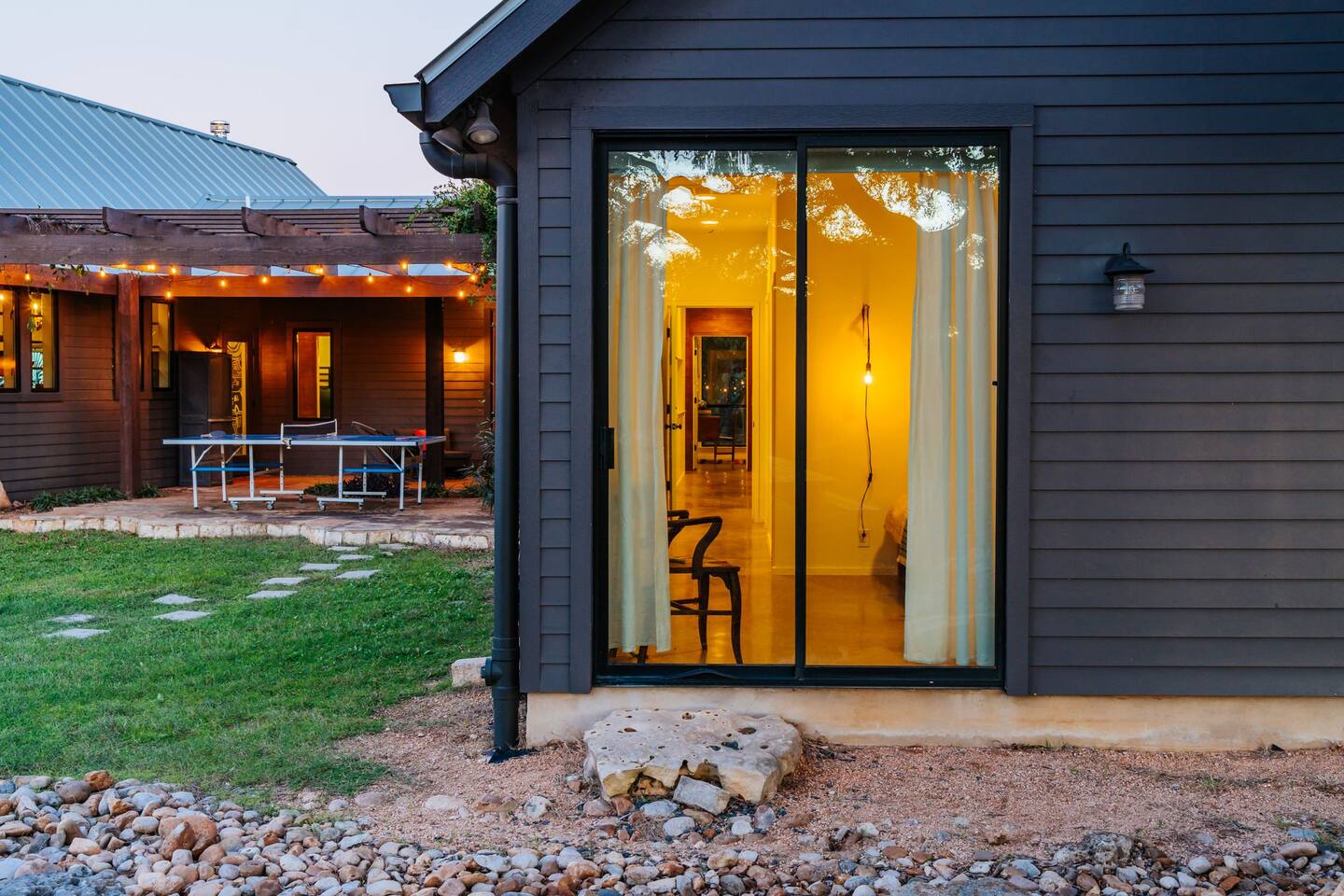 - A 30,000 gallon rain water cistern provides water to the house. We appreciate guests being mindful of water usage. -The property is located at the end of a long dirt road; the road can get muddy when it rains. -The house is on septic and we ask guests not to flush any products (other than toilet paper) to help ensure an uninterrupted stay. A trash bin is provided in each restroom to dispose of other products. -No parties or events. -No glass by the pool. -No pets in the pool. -No smoking. -By booking, you accept responsibility for any damage/extra cleaning costs your dog causes during the stay. No dogs left home alone unless crated. Dogs must be 1 year of age. Please clean up after your pet. $150 pet fee. -Hosts retain the right to require immediate removal of any dog if the animal is being disruptive to the neighborhood, causing damage, posing a risk to people or other animals, or for other major violations. -Undisclosed pets will be an automatic $200 charge. -Be aware that Texas Hill Country graces this property with critters of all kind. *Cleaning Fee to be charged at time of booking.*
