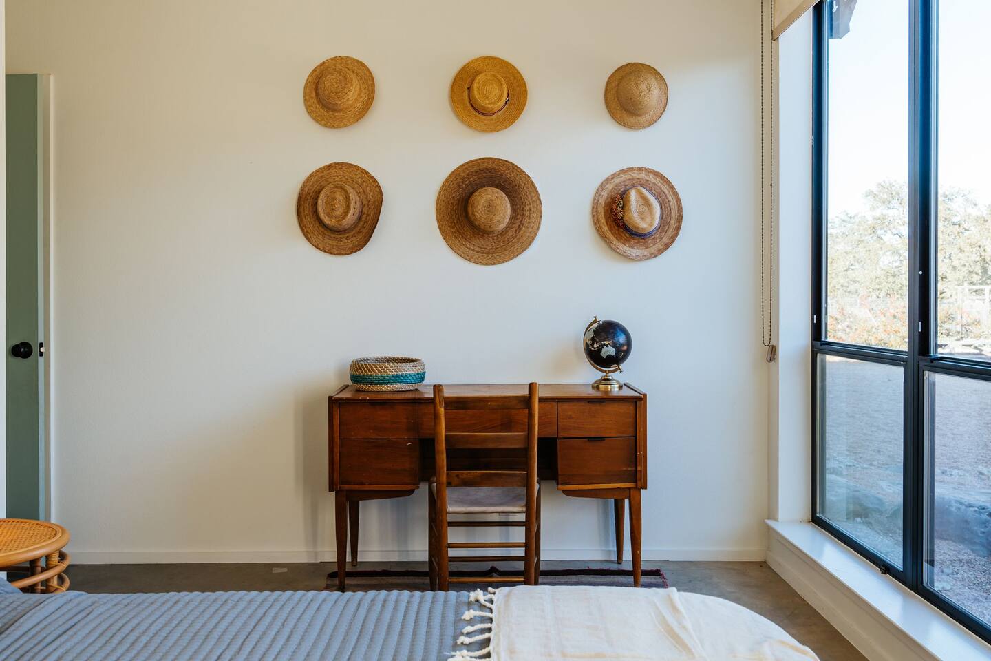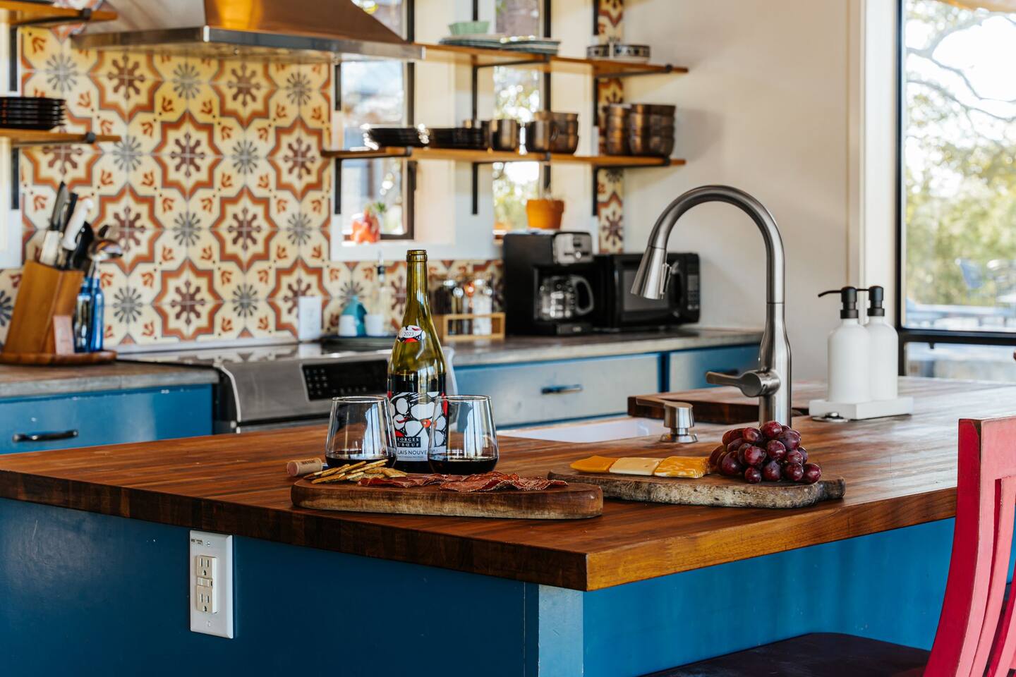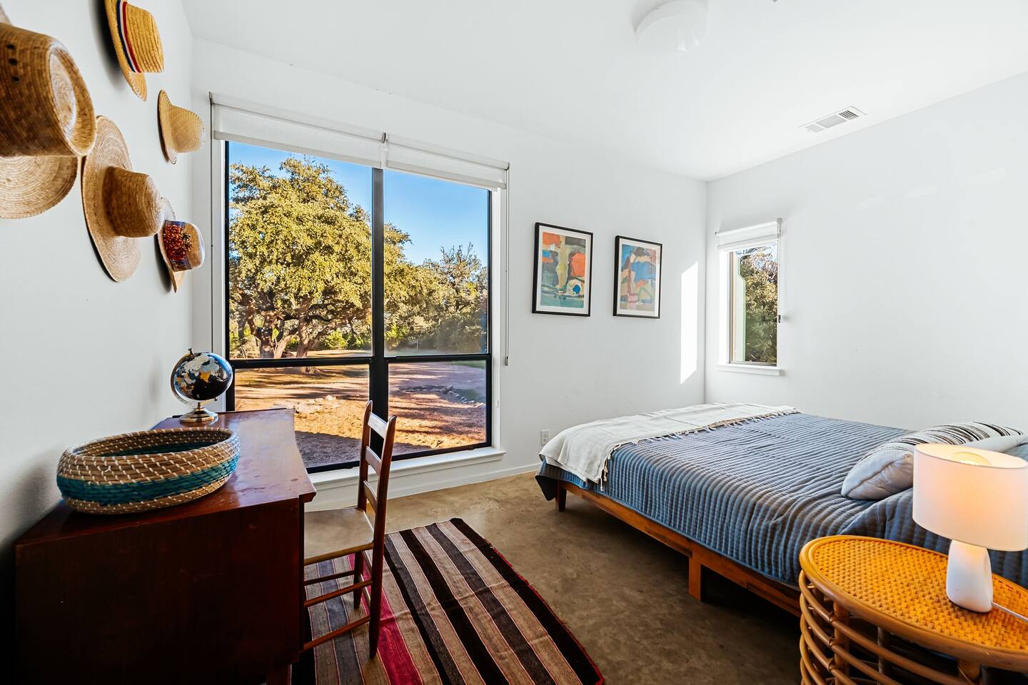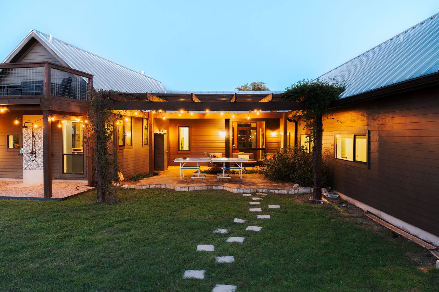 Between the main house and the casita, this beautiful property has 6 bedrooms and accommodates up to 14 guests. KEY FEATURES Main House: ☀ Sleeps 10; 5 bedrooms - 3 king, 1 queen, 1 twin over twin bunk bed ☀ 3 Bathrooms; 1 combo shower/tub, 2 standing shower bathrooms ☀ Modern and well-equipped kitchen with coffee bar and seating for 10 guests ☀ Washer and dryer ☀ WiFi and a 55” Frame TV in Living Room Casita: ☀ Sleeps up to 4; 1 bedroom with king bed; 1 trundle bed in living room ☀ 1 Bathroom with standing shower ☀ Kitchen with coffee bar and seating for 4 people ☀ Hot tub on back patio ☀ WiFi and Roku entertainment on TV ☆☆ HIGHLIGHTS ☆☆ ☀ Pool with lounge deck ☀ Hot tub on back patio of casita ☀ Dog-friendly ☀ Serene outdoor living spaces ☀ Fire pit, charcoal grill, bocce ball, ping pong table, soccer field ☀ Gorgeous views of the countryside ☀ Located in the heart of Driftwood, TX ☀ Organic body wash/shampoo/conditioner provided ☆☆ MAIN HOUSE - BEDROOMS ☆☆ The main house accommodates 10 guests in 5 bedrooms. The H-shaped floor plan enables the bedroom wing to tuck into a grove of junipers. The master bedroom is fitted with a king-size bed and an en suite full bathroom. It boasts floor to ceiling windows that immerse you into the countryside. Two other bedrooms have king beds, one bedroom has a queen, and the small fifth bedroom has a twin over twin bunk bed. ☆☆ MAIN HOUSE - KITCHEN & LIVING ROOM ☆☆ The open-concept kitchen is fully equipped with all the appliances, utensils and cookware you need to feel at home. You will also find a coffee bar with organic coffee beans, a french press, and a drip coffee maker. The dining area seats up to 10 guests at the gorgeous wooden table. The indoor living room is outfitted with a 55” Frame TV, allowing full access to your favorite streaming services. The space is filled with natural light shining through the numerous windows. Enjoy the spectacular natural surroundings while inside or out. This thoughtfully-designed home provides a dedicated laundry area. ☆☆ CASITA - BEDROOM ☆☆ The bedroom in the casita has a king-size bed and an en suite full bathroom. The living room has a trundle bed for two guests. Please note guests sleeping on the living room trundle bed will need to go through the bedroom to access the bathroom. ☆☆ CASITA - KITCHEN & LIVING ROOM ☆☆ The kitchen is stocked with basic necessities plus a coffee bar with organic coffee beans, a french press, and a drip coffee maker. The dining area seats up to 4 guests. The living room is outfitted with a small TV with a Roku entertainment system, allowing full access to your favorite streaming services. ☆☆ OUTSIDE SPACE ☆☆ The exterior of this 5-acre property boasts beautiful countryside views and unrivaled privacy. A pool and lounge deck allows you to soak up the surroundings. The hot tub on the back patio of the casita gives you a place to unwind. Picnic tables around the house give guests multiple scenery options to sit together. The fire pit is a wonderful spot to wind down the day. Bocce ball court under string lights in the front. There is a quaint seating area and ping pong table situated in the middle patio of this lovely home. The property also has its very own private soccer field. Guests are also a short 10-minute drive away from hiking at Charro Ranch Park. ★☆ Book Today & Let Us Take Care Of You In Driftwood! ☆★ 3 minute drive to Stonehouse Villa 4 minute drive to Sonder Coffee Lounge 6 minute drive to Duchman Family Winery & Trattoria Lisina 6 minute drive to Vista Brewing 6 minute drive to The Salt Lick BBQ 9 minute drive to Driftwood Estate Winery 14 minute drive to downtown Dripping Springs 16 minute drive to Jacob's Well 19 minute drive to downtown Wimberley 20 minute drive to Blue Hole Regional Park